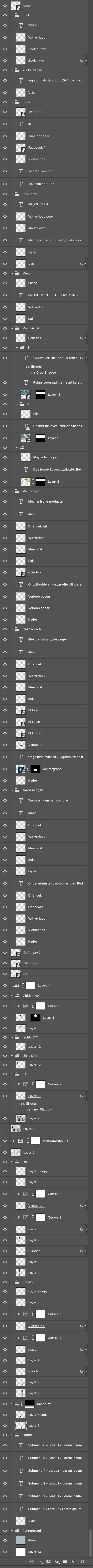 Hoewel mijn Photoshopbestanden er voor de klant overzichtelijk uitzagen, waren ze dat onder de motorkap absoluut niet. Een simpele website bestond als snel uit een paar honderd lagen waarbij elke aanpassing een tijdrovende bezigheid was. Een kleuraanpassing kon niet gedaan worden door het aanpassen van een enkele ‘swatch’ maar door elk element die de specifieke kleur had te zoeken in de lagen en handmatig aan te passen naar de nieuwe kleur. Het aanpassen van teksten, het updaten van afbeeldingen, het verplaatsen van objecten, het verschuiven van hulplijnen, alles kostte zeeën van tijd. Daar kwam bij dat je voor elke pagina een eigen bestand moest maken omdat Photoshop geen meerdere pagina’s ondersteunt in één bestand (sinds 2015 heeft het wel ‘artboards’). Elke aanpassing die in één bestand al tijdrovend was, moest dan nog een aantal keer herhaald worden voor alle subpagina’s.