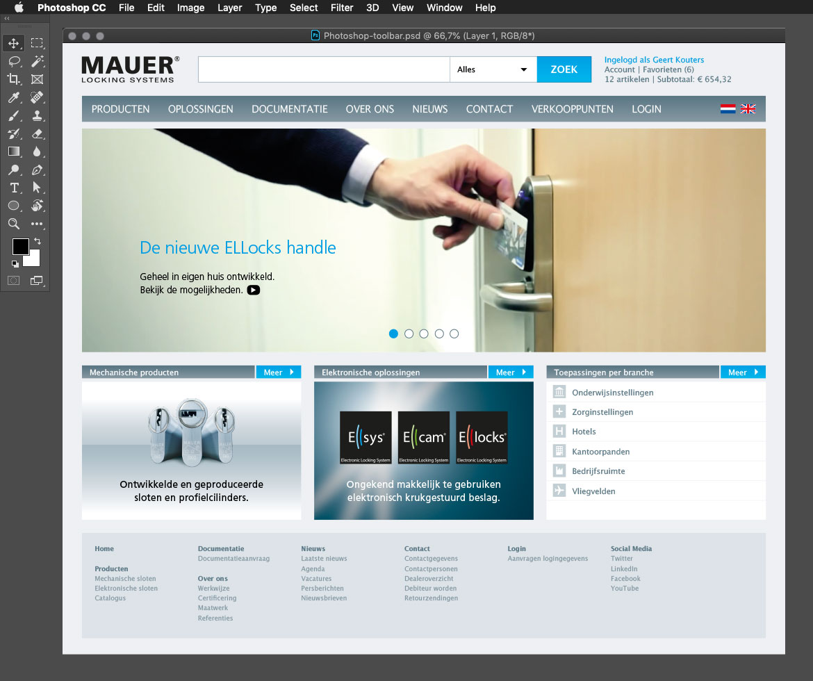 Ten tweede zit je als ontwerper op het snijvlak van de klant en de programmeur. De ontwerpen die ik maak moeten mijn klant een beeld geven hoe de site er uit gaat zien, navigeert of ’voelt’ en na akkoord moet ik de bestanden aanleveren bij mijn technische man die er ook daadwerkelijk een werkende website van moet kunnen bouwen. Het bestand dat ik maak moet dus makkelijk bewerkbaar zijn om aanpassingen van de klant door te voeren en bruikbaar zijn voor de bouwer die er de layout, kleuren, fonts en afbeeldingen uit kan halen om het om te zetten naar html, css, jpg’s, svg’s etc.